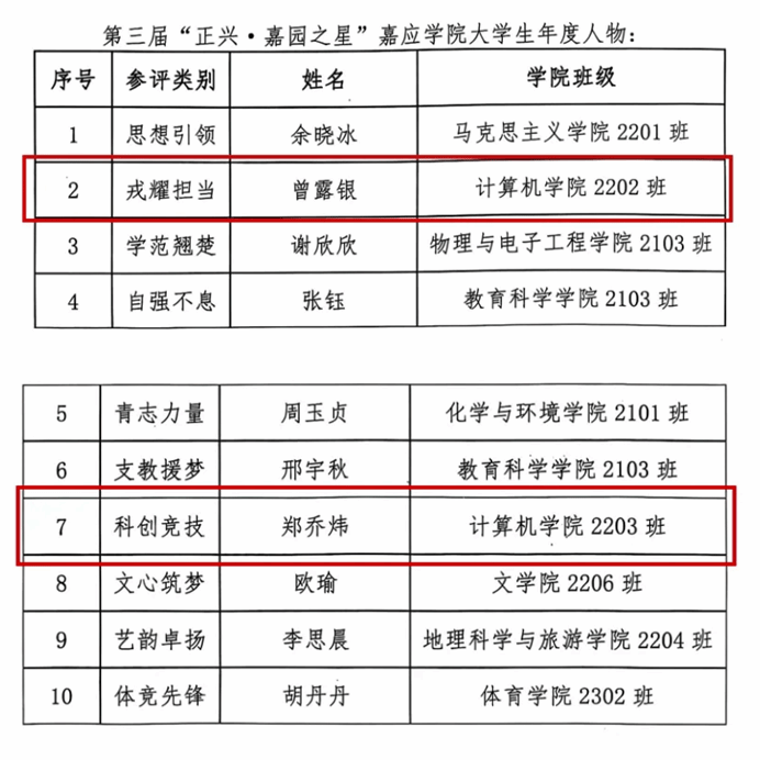 暮色中的嘉应学院总藏着惊喜 —— 实验室的灯光刺破夜幕,那是代码与灵感的碰撞;图书馆的长桌前,翻动书页的沙沙声与笔尖游走的轨迹,勾勒出知识的图腾。在这片涌动着青春热浪的沃土上,计算机学院的两颗 “新星” 正以破云之势闪耀登场!他们在代码的浩瀚星河中披荆斩棘,在学术与实践的征途上挥汗如雨,终于捧回 “正兴・嘉园之星 ” 嘉应学院大学生年度人物的至高荣誉。这不仅是个人的加冕时刻,更是整个学院的荣光,现在,让我们推开时光的门扉,探寻他们光芒背后的滚烫故事。