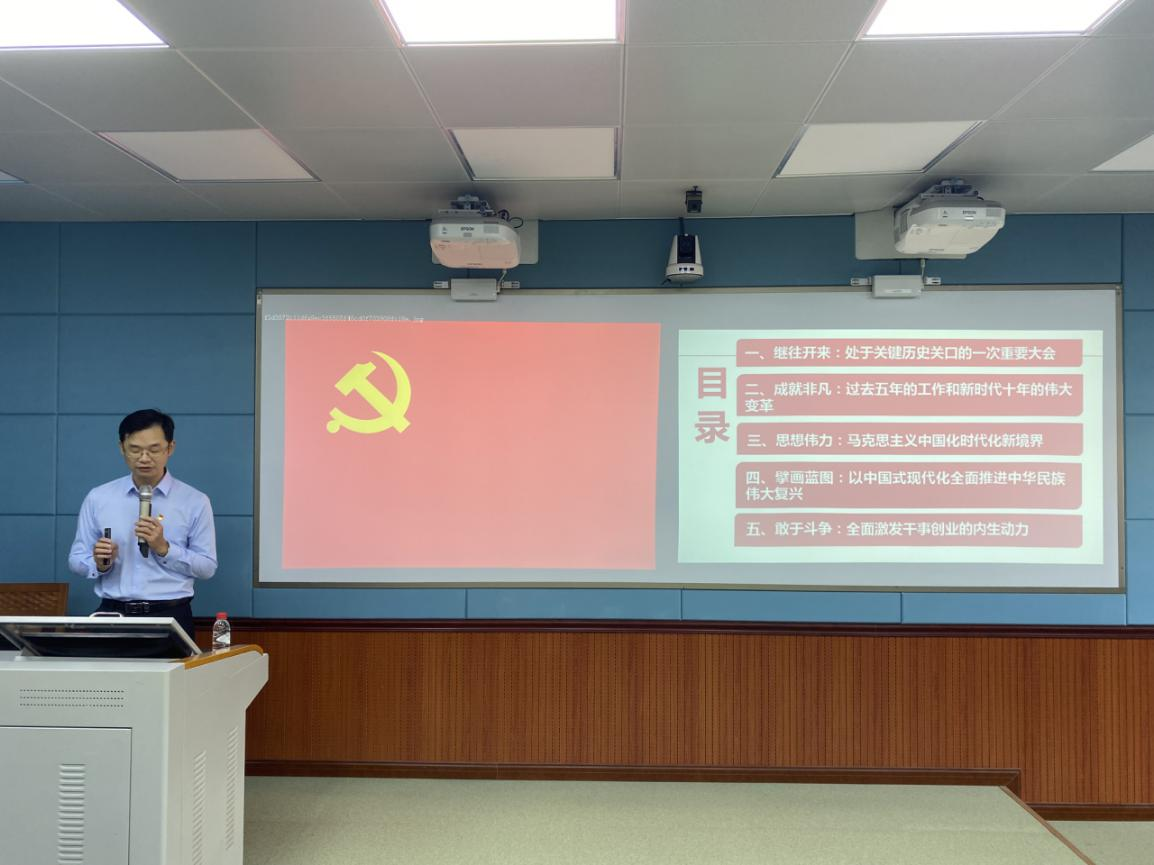 11月16日下午,我院在锡昌科技楼517室举办学习党的二十大精神专题报告会,学院党委邀请马克思主义学院李学明副教授做专题辅导讲座。会议由学院党委副书记张敏主持,学院党政领导班子全体成员、师生党员及网络中心、继续教育学院教工党员共70余人参加。