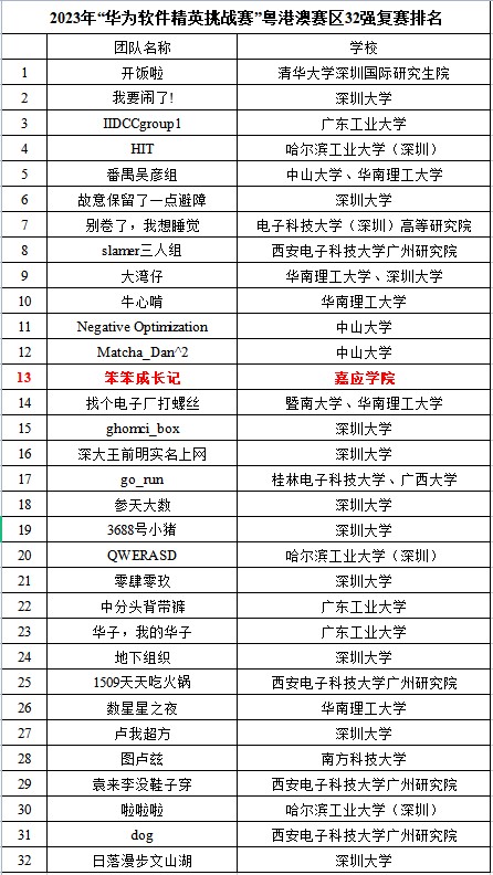 近日,由华为云主办的2023年“华为软件精英挑战赛”落下帷幕,计算机学院许昱华、陈雪武、范淮宝组成的“笨笨成长记”团队在与来自粤港澳地区高校和研究院所的544支团队比拼中荣获第4名,一举晋级区域复赛,经过激烈比拼击败了众多名校本科生和研究生组成的队伍,在32支晋级队伍中国名列第13名,荣获2023年“华为软件精英挑战赛”粤港澳赛区二等奖。